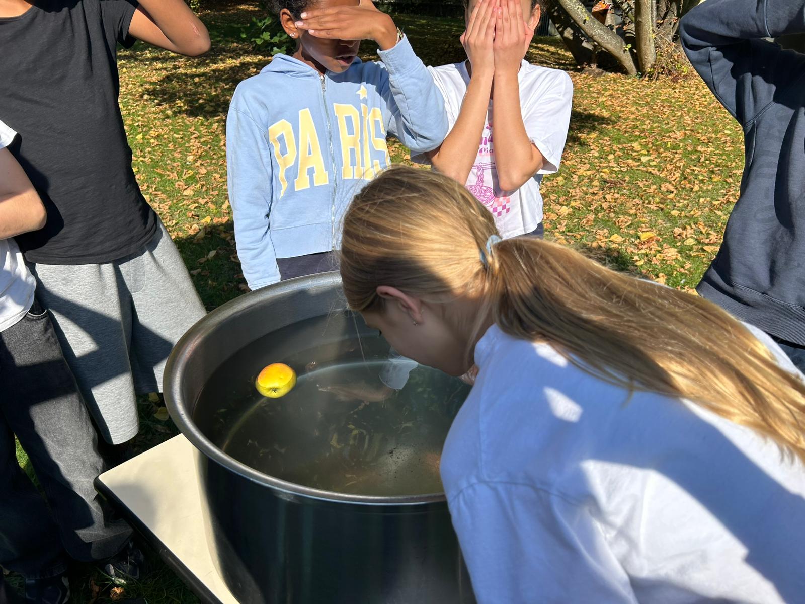 Les élèves se sont prêtés au jeu avec enthousiasme, entre rires et éclaboussures. L’activité a permis non seulement de découvrir une tradition populaire britannique, mais aussi de travailler le vocabulaire lié à Halloween et à la culture festive anglaise.