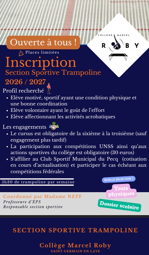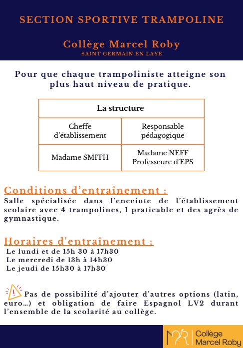 Les Sections Sportives Trampoline du Collège Marcel Roby et du Lycée Jeanne d’Albret de St Germain en Laye ont vu le jour en 1995.